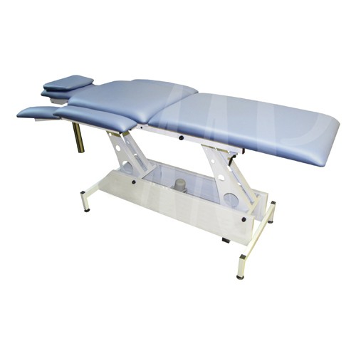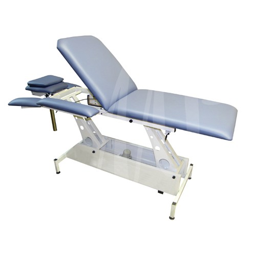 Одномоторный массажный стол, трехсекционный, оснащен регулирующимися бесступенчато передними подлокотниками, боковыми поддержками для рук, жесткая фиксация подголовника и дополнительная регулировка для воротниковой зоны осуществляется газовой пружиной с промежуточной фиксацией.