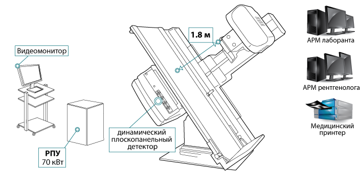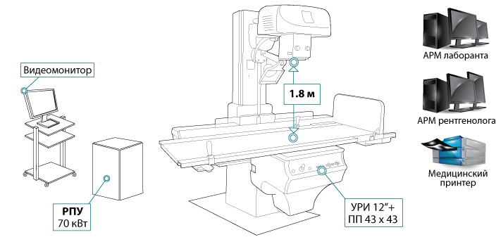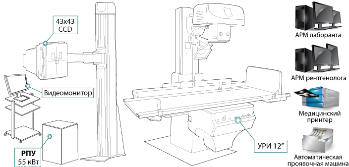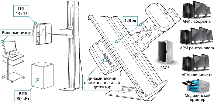 Универсальная комплектация, в которую входят телеуправляемый рентгенодиагностический аппарат и вертикальная стойка с цифровым детектором, обеспечивает возможность проведения рентгеноскопических исследований, получения пленочных и цифровых снимков.