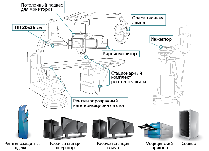 Ангиографический комплекс с детектором на базе усилителя рентгеновского излучения Комплектация ангиографического комплекса с детектором на базе УРИ 13" является надежным и простым в использовании решением для проведения базовых интервенционных процедур.