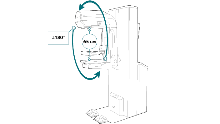 - Широкий диапазон вращения дуги дает возможность реализовать практически любую маммографическую проекцию в зависимости от локализации исследуемой патологии.