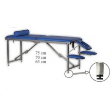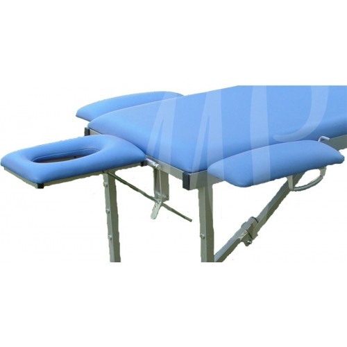 Массажный стол оснащен двумя подлокотниками для рук, которые можно размещать как в лицевой части, так и по обеим сторонам стола, в зависимости от выполняемых процедур. Подголовник может плавно изменять угол наклона и имеет специальное отверстие для лица.