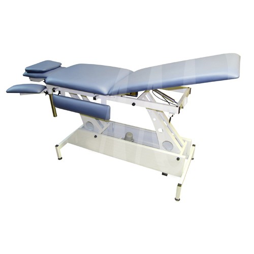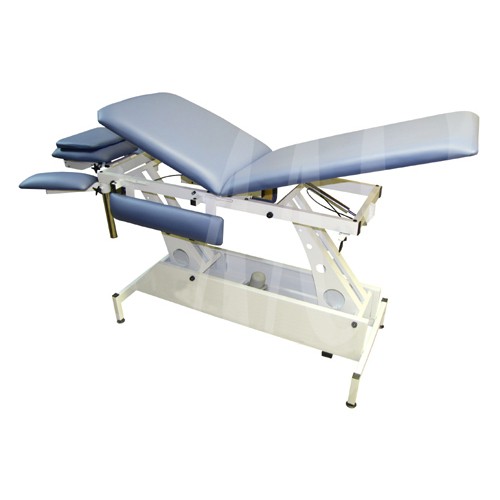 Одномоторный массажный стол, трехсекционный, оснащен регулирующимися бесступенчато передними подлокотниками, боковыми поддержками для рук, жесткая фиксация подголовника и дополнительная регулировка для воротниковой зоны осуществляется газовой пружиной с промежуточной фиксацией.