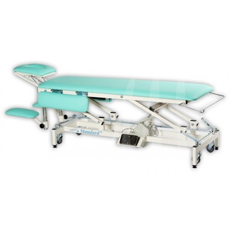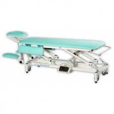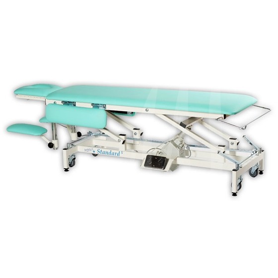 Шестисекционный стационарный массажный стол FysioTech Standard-M с электроприводом имеет удобную регулировку угла наклона лицевой части, оснащенной специальным газовым амортизатором. Данная модель имеет два передних подлокотника с плавной, бесступенчатой регулировкой, и два легко трансформирующихся боковых подлокотника. Кушетка оснащена держателем для рулона бумаги.