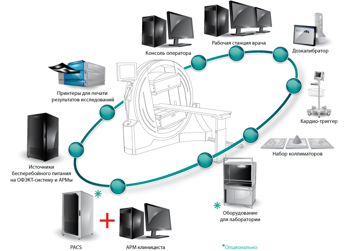 Комплекс изотопной диагностики — оптимальная комплектация >> В комплектацию входят все необходимые специализированные пакеты, предназначенные для проведения исследований и анализа результатов. Любая комплектация аппарата может быть изменена по инициативе производителя или желанию заказчика. Комплекс изотопной диагностики — оптимальная комплектация