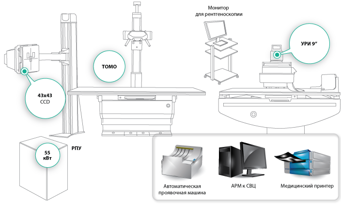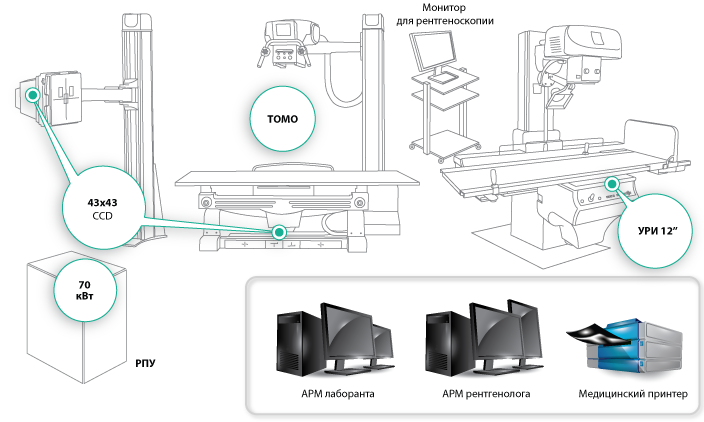 Комплекс рентгенодиагностический на три рабочих места представлен в различных комплектациях.