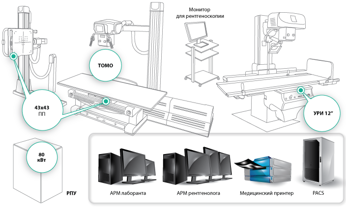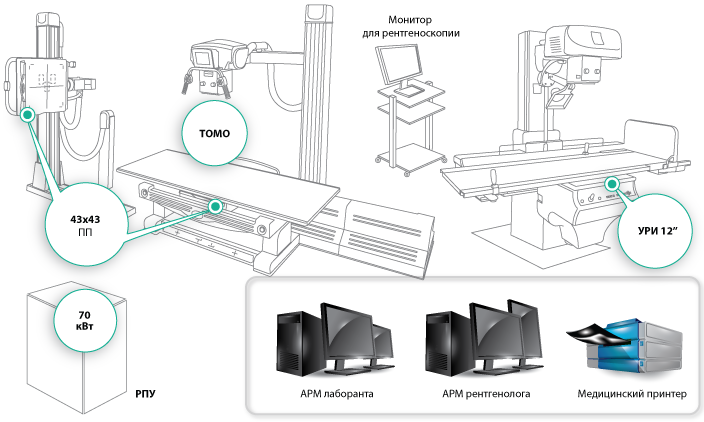 Комплекс рентгенодиагностический на три рабочих места с плоскими панелями представлен в различных комплектациях.
